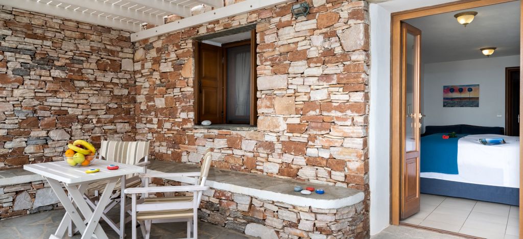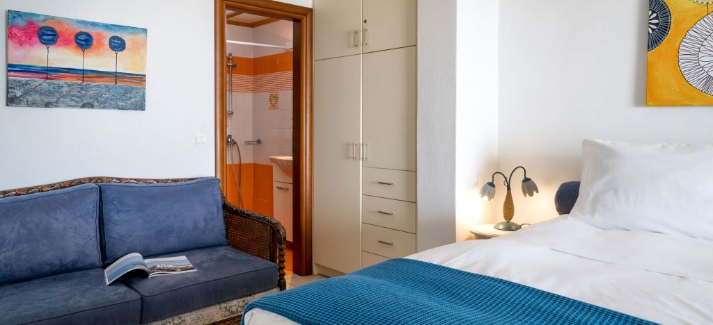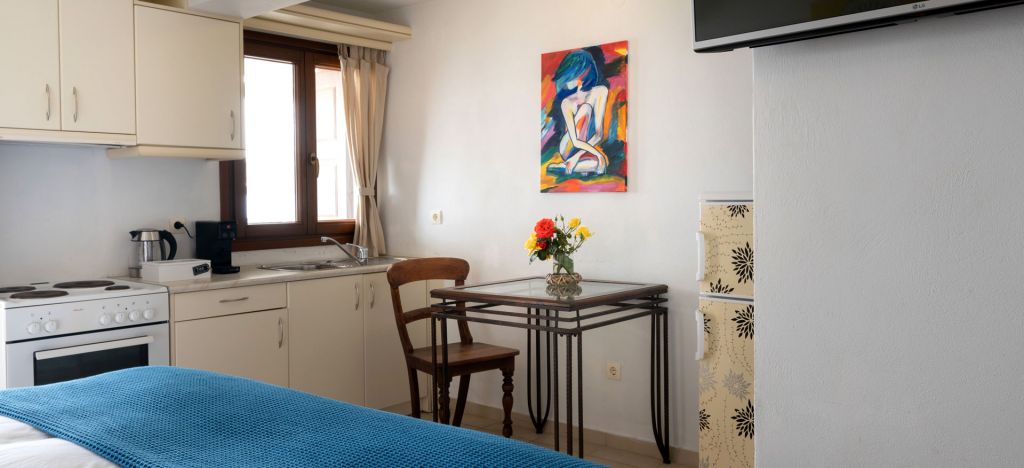 The Standard Studio is a bright, spacious room that has a relaxing, romantic aura. It provides you with a COCO MAT king size bed of 1.80 × 2.20, a kitchen with all the necessary facilities, a refrigerator, a Plasma TV, air conditioning, a hairdryer, free WiFi, a free parking space and a veranda with an unhindered view of the Aegean Sea, the breathtaking sunrise and the garden. The studio features a private bathroom with a shower, free toiletries and, daily cleaning services. It can accommodate up to 2 people.